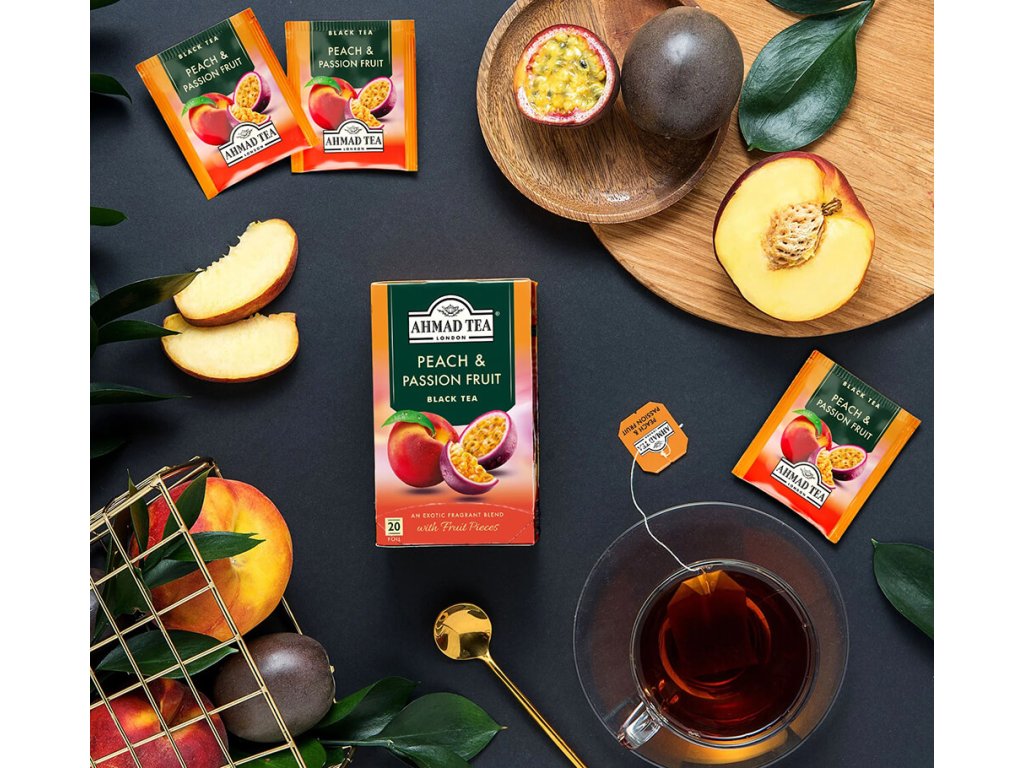Ahmad Tea Peach & Passion Fruit je lahodný černý čaj, ve kterém se setkává sladká broskev s exotickou mučenkou v dokonale vyvážené ovocné harmonii.