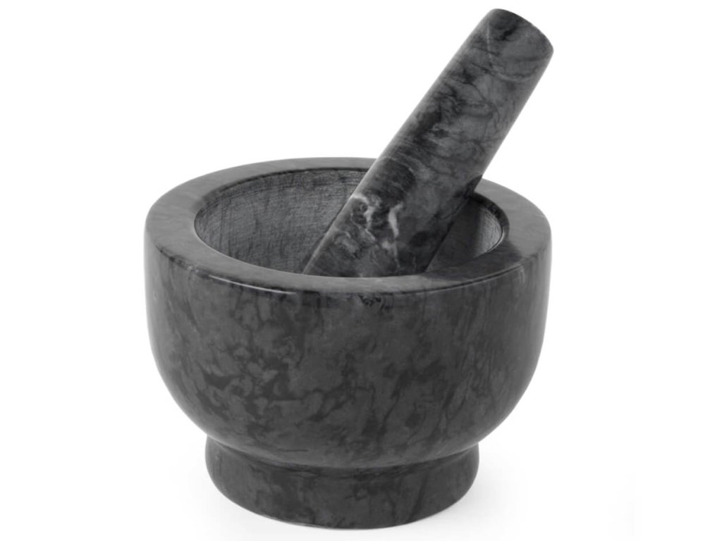 Žulový hmoždíř s průměrem 9 cm (hloubkou 5,5 cm) je nejen praktickým nástrojem, ale také elegantním doplňkem, který zaujme svým černošedým designem. Je vyroben z odolné žuly, která zaručuje dlouhou životnost a odolnost proti poškrábání.