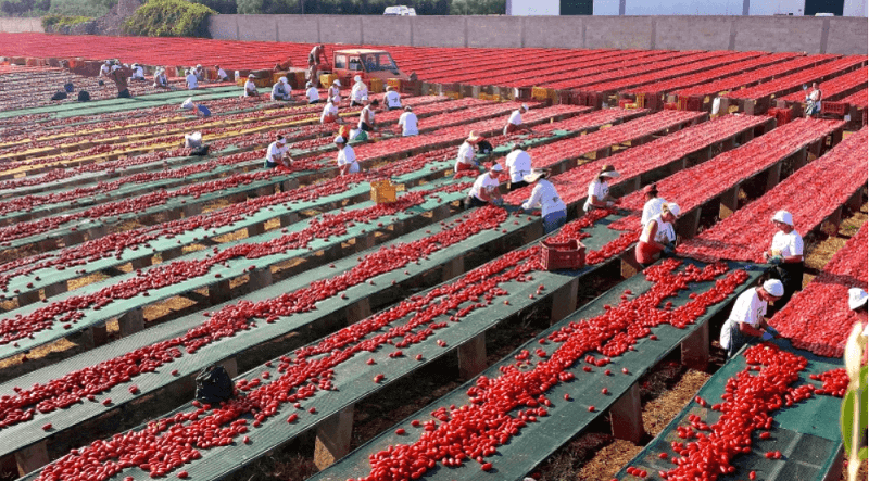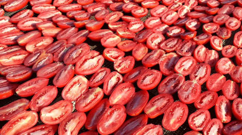 Potom sa nakrájané paradajky rozprestrú na veľké sitá a sušia sa po dobu niekoľkých dní. Tieto paradajky už nie sú ďalej konzervované ani dosladzované, je to čisto prírodný produkt. Pri sušení stratia paradajky až 93 percent svojej hmotnosti, preto už 100 g sušených paradajok je pekná porcia paradajok.