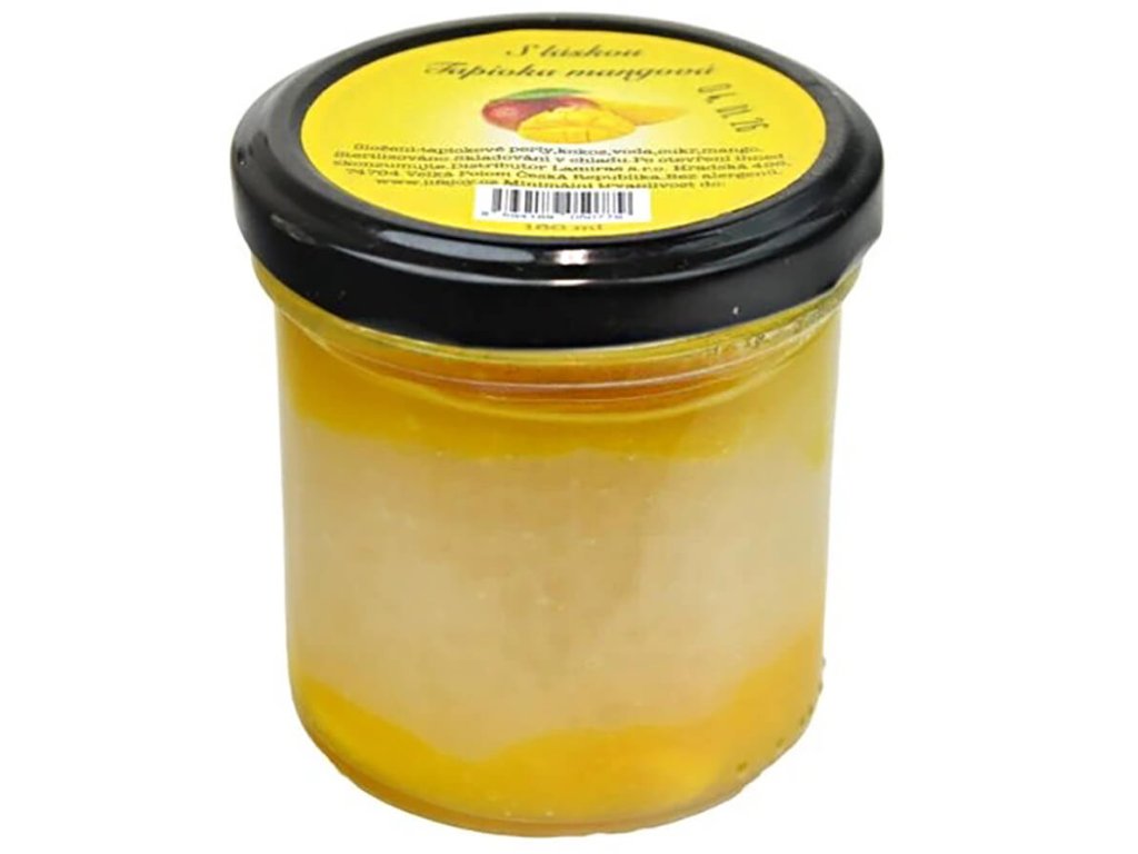 Uvnitř se ukrývají drobné bílé perličky tapioky – tradiční suroviny z hlízy manioku, které dodávají dezertu lehkost a jedinečnou texturu. Mangový přeliv s kousky ovoce dodává každé lžičce plnou, osvěžující chuť a vůni tropů.